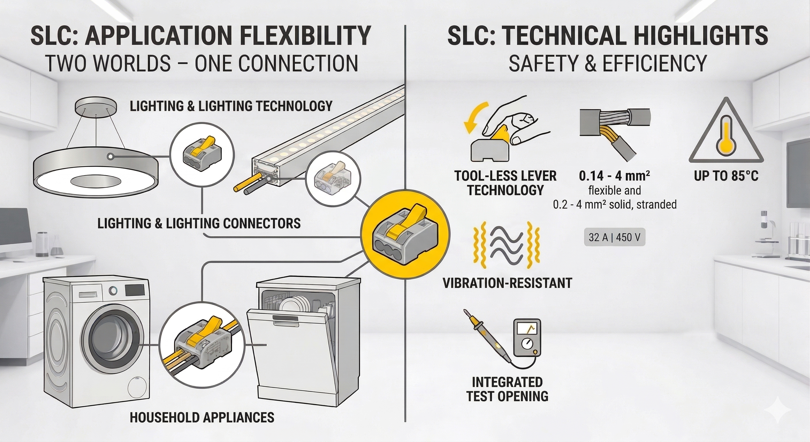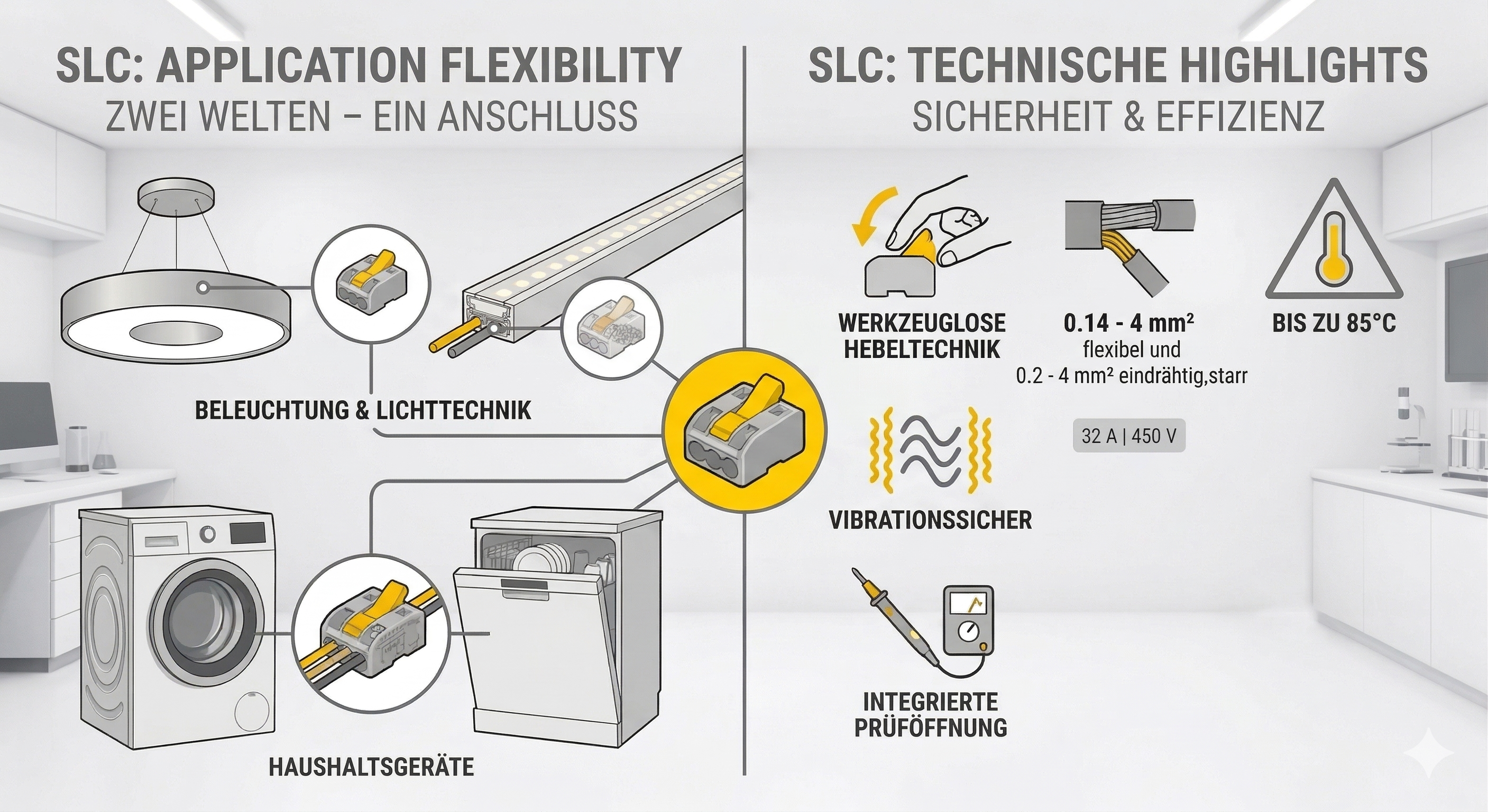 Ob in filigranen Lichtanwendungen oder beim robusten Anschluss von Haushaltsgeräten – die SLC ist überall zu Hause. Dank der Hebeltechnik lassen sich Verbindungen im Feld oder in der Produktion in Sekundenschnelle herstellen und bei Bedarf genauso einfach wieder lösen.